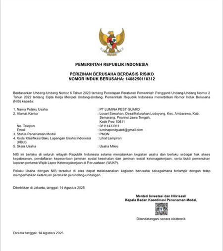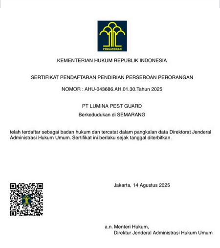 PT Lumina Pest Guard (Lumiguard) adalah perusahaan resmi berbadan hukum yang telah memenuhi seluruh persyaratan legalitas di Indonesia. Dengan dukungan legalitas lengkap, kami memastikan setiap layanan yang diberikan kepada klien memiliki dasar hukum yang jelas, terpercaya, dan profesional meliputi: