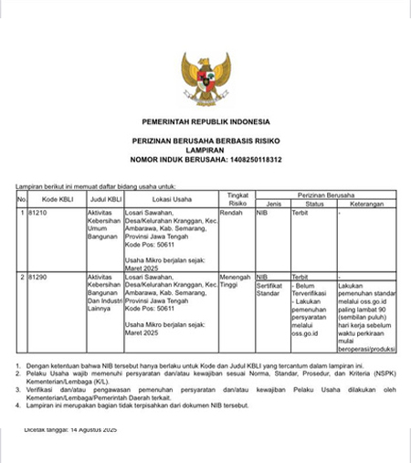 Nomor Induk Berusaha (NIB) serta perizinan usaha (SIUP/TDP) sesuai ketentuan OSS (Online Single Submission) nomor: 1408250118312